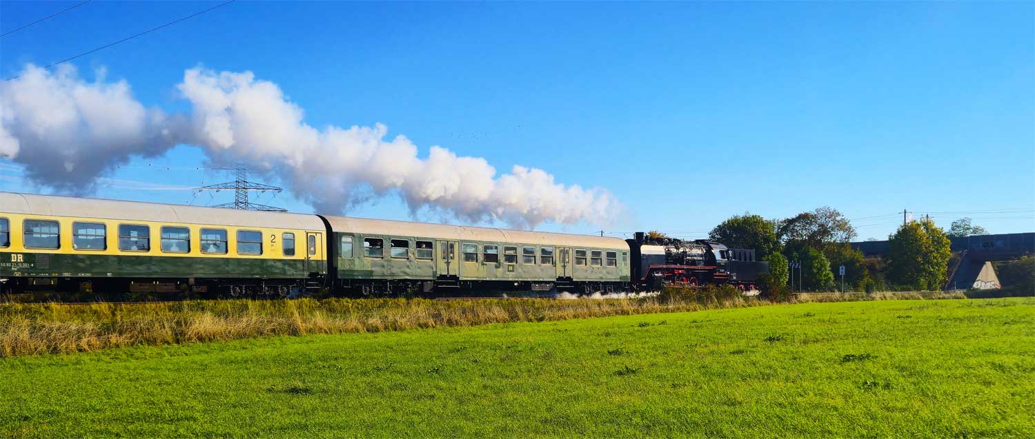 Im Vordergrund ein Fundament der 1946 abgebauten Oberleitung (Reparationsleistungen an die Sowjetunion)