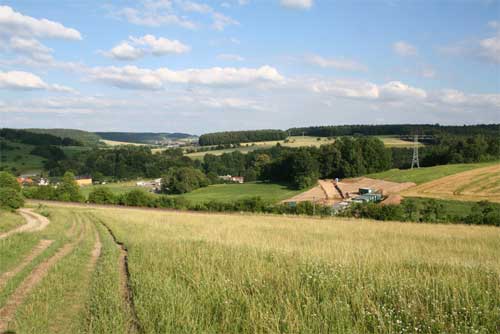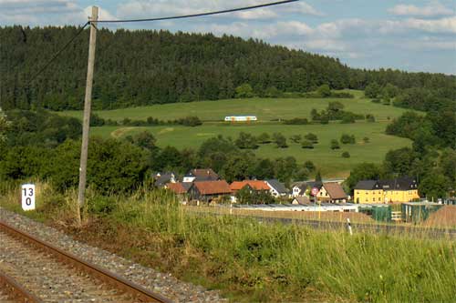 Im Vordergrund das Gleis Eisfeld-Rauenstein. Im Vordergrund der Ort Grümpen und beginnende Bauarbeiten für die 1106 m lange Grümpentalbrücke für die Neubaustrecke Ebensfeld-Erfurt. (Foto: Dirk Ammon, Juli 2006)