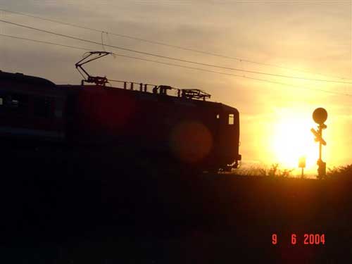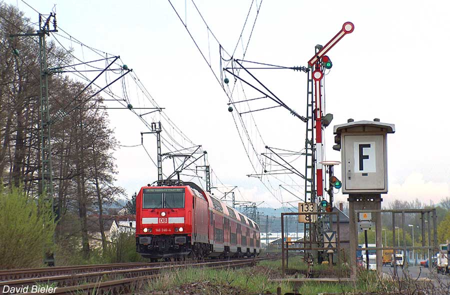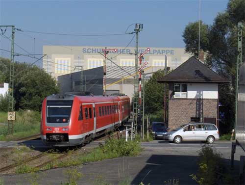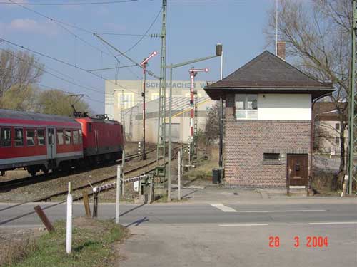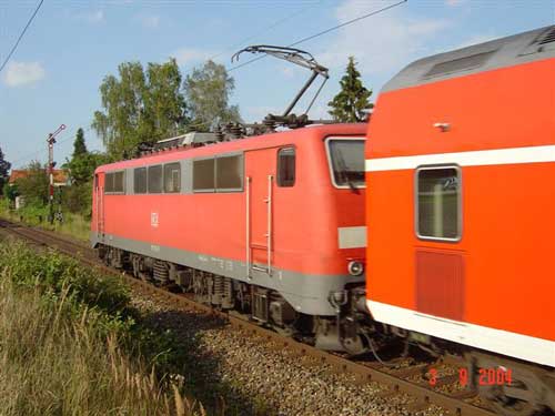 BÜ km 139,2 Das besondere am Bild ist, dass die Lok in Fahrtrichtung vor dem Steuerwagen läuft (Steuerwagen evtl. defekt). Kenner beachten den Stromabnehmer (Foto: Dirk Ammon, September 2004) |