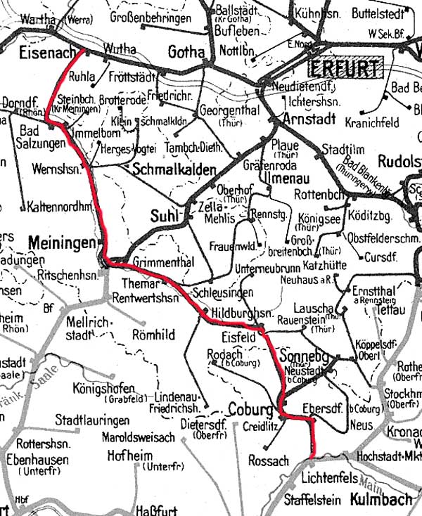 Eisenach 0,0 - Meiningen 60,69 - Eisfeld 108,26 - Coburg 130,11 - Lichtenfels 150,99 (1929)