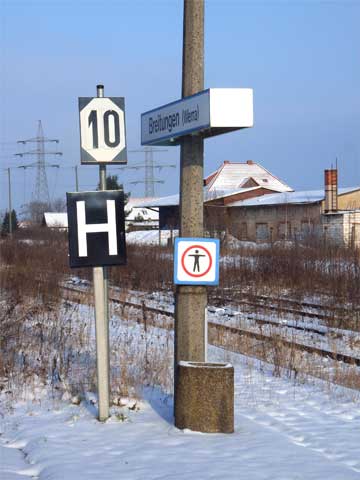 Bf Breitungen (Werra) Unzulässiges Signal über der H-Tafel Das Signal über der H-Tafel (So 8) ist nicht im Signalbuch DV 301 zu finden. Es soll wohl eine neue Kreation der DB AG darstellen (Kombination aus Signal Lf 5 und Lf 7). Wahrscheinlich sollten aber nur Kosten gespart werden. Hoffentlich weis der Lok- oder Triebfahrzeugführer bescheid. (Foto: Steffen Dietsch, Dezember 2005) |