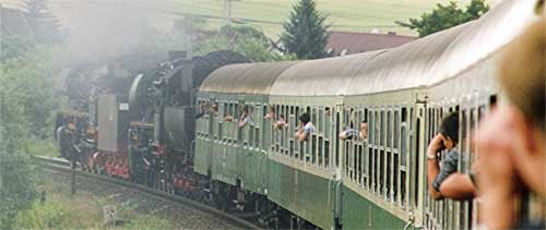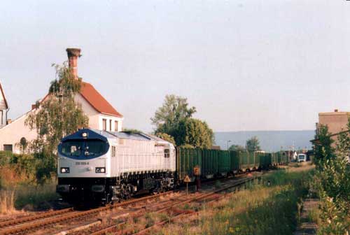 Das Foto zeigt einen Leerwagenzug mit BlueTiger am 26.06.04 bei der Durchfahrt durch Immelborn in Richtung Themar. (Foto: Gunnar Möller)