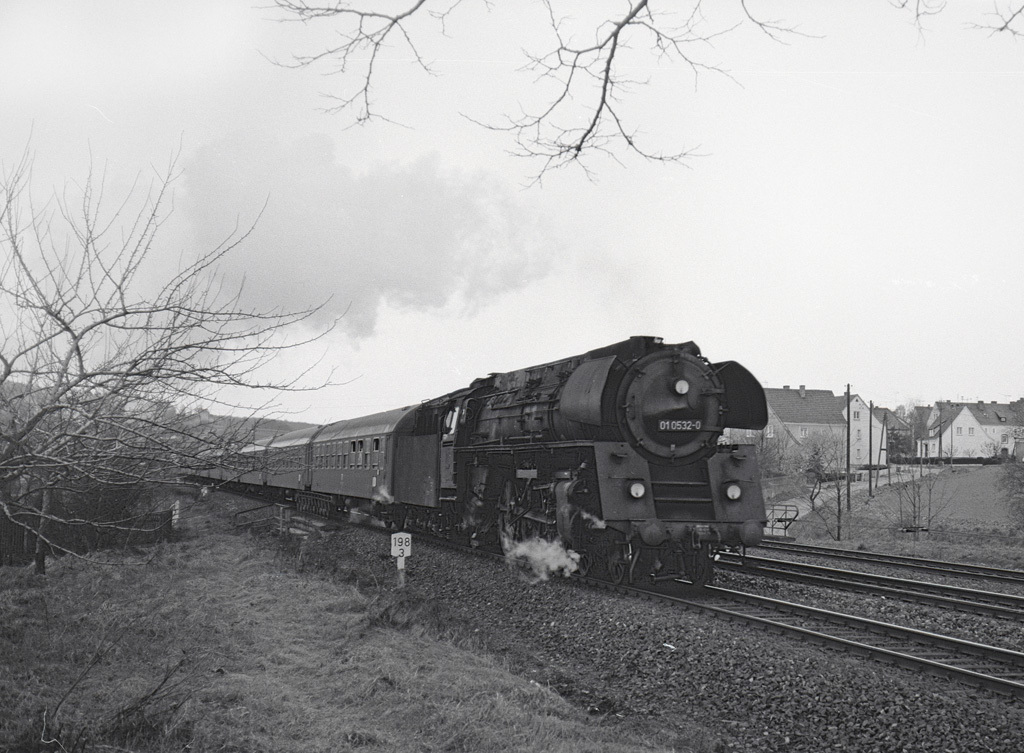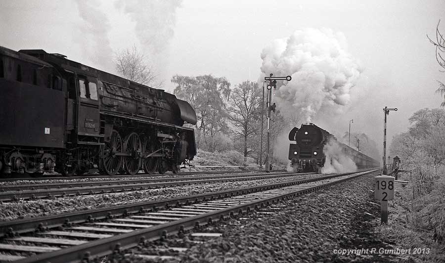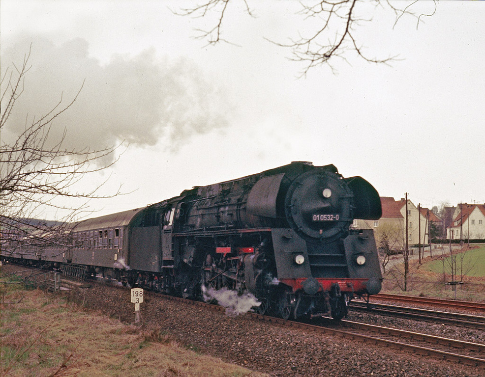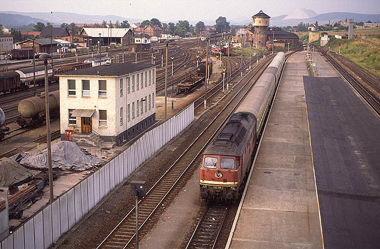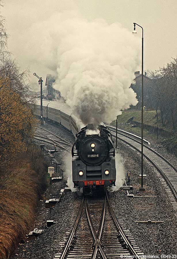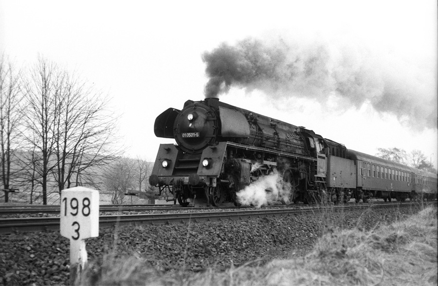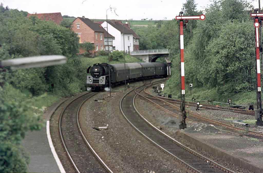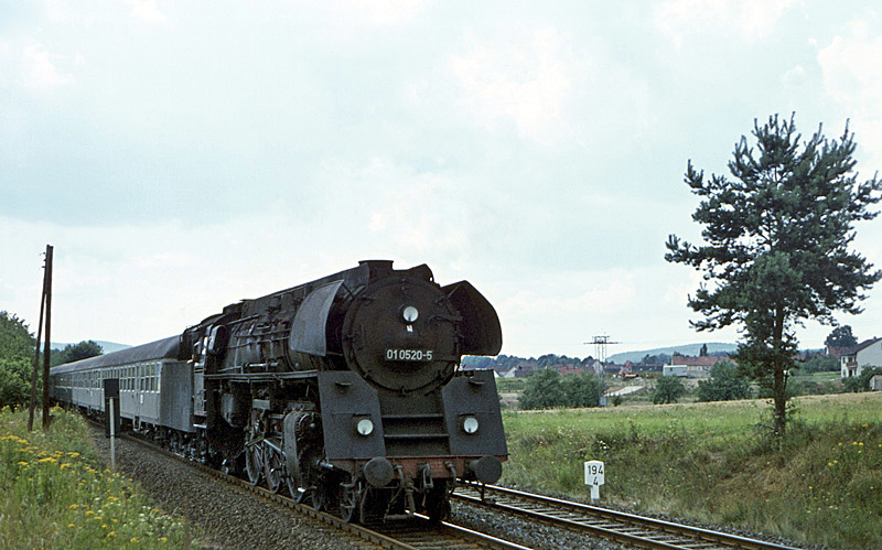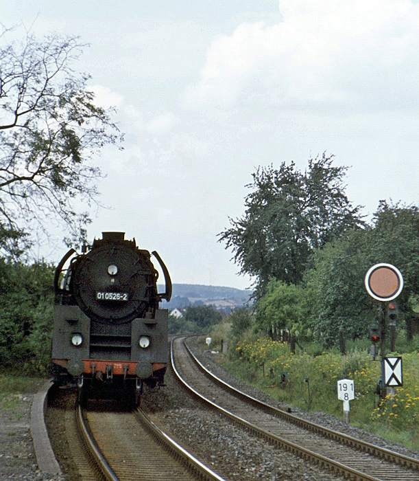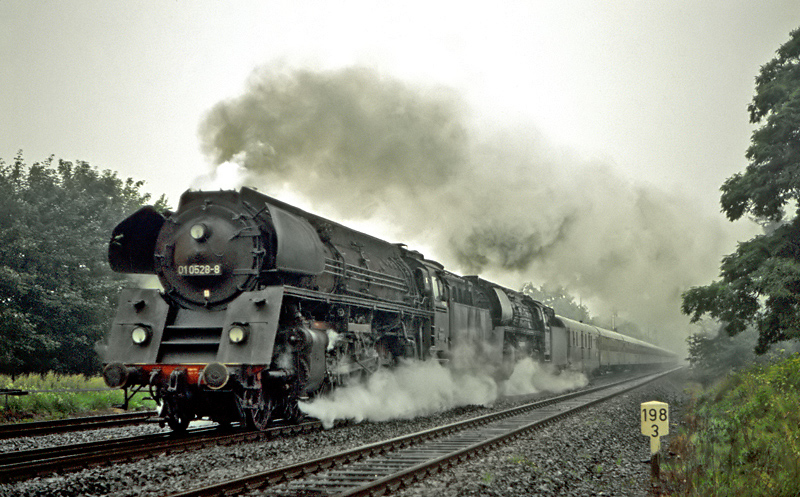 Am Sonntag (30.07.1972) blieb mir das schlechte Wetter treu, was umso schmerzlicher war, als der D 1100 (Stralsund –) Erfurt - Bebra (an 9:40 Uhr) (- D 1152 Frankfurt [Main]) mit Vorspann – 01 0528 vor 01 0501 verkehrte.