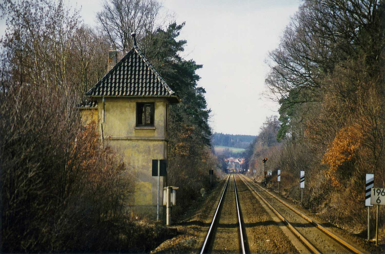0,0 - Bk Gs Bf Großheringen 2,29 heute: km -0,84 der Strecke Abzw. Saaleck -0,84 - Jena Saalbf 25,50 - Saalfeld (Saale) 74,83 seit 1967 außer Betrieb, bis ca. 1992 nur noch Bedienung des Blocksignals Ri Bad Kösen |