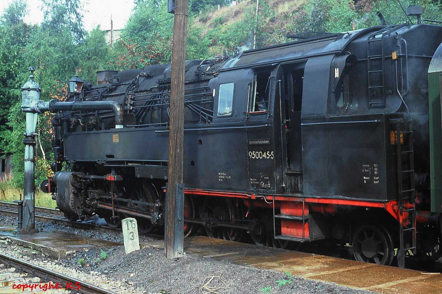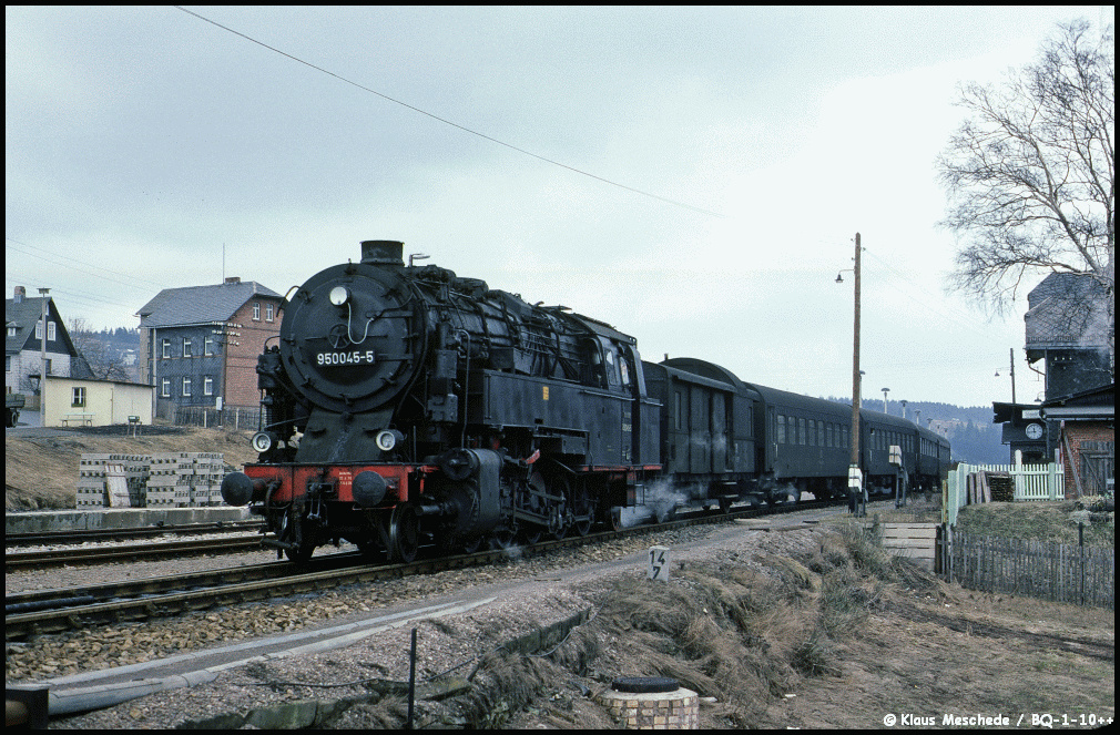 | Probstzella | 0,00 | km 164,99 der Strecke (Leipzig Hbf 0,0) - Leipzig-Leutzsch 6,69 - Zeitz 44,61 - Gera Hbf 72,81 - Saalfeld (Saale) 140,01 - Probstzella 164,99 - Grenze DDR/BRD 166,66 = 52,91 - (Hochstadt-Marktzeuln 0,0) |