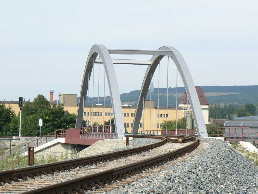 Stabbogenbrücke überspannt die Strecke Halle (Saale) Hbf - Guntershausen mit km 86,2