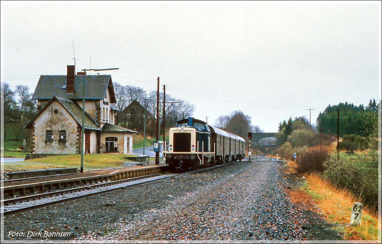 | Gerolstein | 94,14 | km 101,05 der Strecke Kalscheuren (Hürth-Kalscheuren) 0,63 - Euskirchen 30,07 - Jünkerath 82,97 - Gerolstein 101,05 - Ehrang 163,46 |