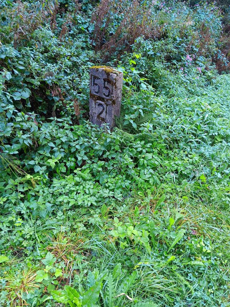 Davor der alte Myriameterstein 6 mit oben angebrachter Zahl 600 hm.