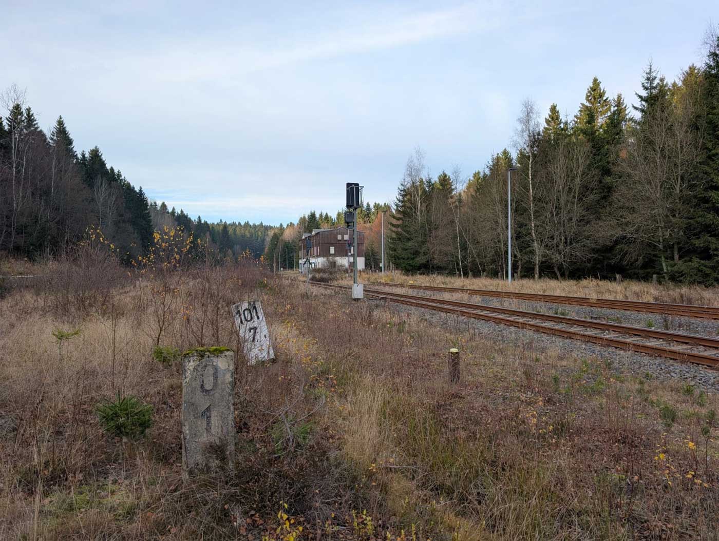 | km 25,69 der Strecke Aš (Asch) 0,0 - Grenze Tschechoslowakei/Deutschland 16,870 - Arnsgrün 18,54 - Adorf (Vogtl) 25,69 (AA) |