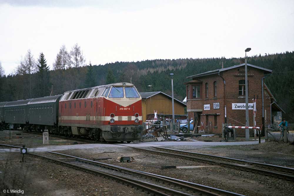 | Zwotental | 101,568 | km -0,42 der Strecke Zwotental 0,0 - Klingenthal 8,234 - Grenze Deutschland/Tschechoslowakei 8,770 = {km 27,452 - Sokolov [früher: Falkenau (Eger)] 0,0 } (ZK) |