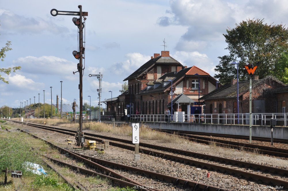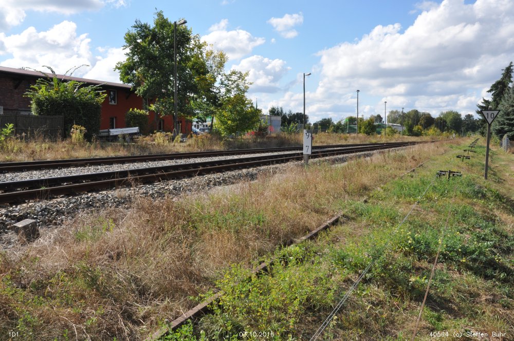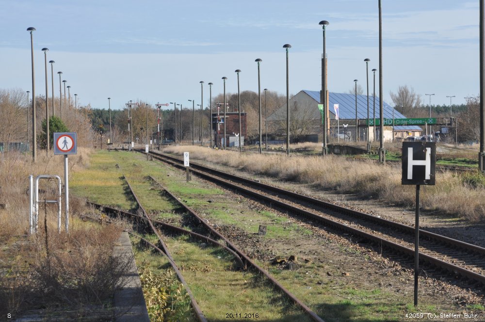 | km 113,662 der Strecke Falkenberg (Elster) 0,31 - Luckau-Uckro 49,40 - Lübben (Spreewald) 73,52 - Tauche (b Beeskow) 105,45 - Streckenunterbrechung - Beeskow 113,66 (6826) | ||
