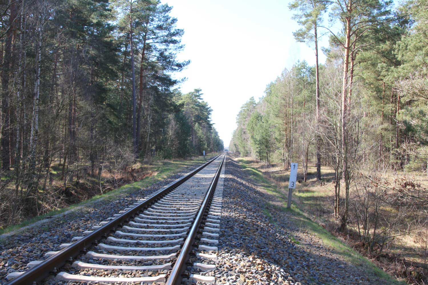 km 1,0 (Tafel und Stein) zwischen Grunow (Niederlausitz) und Schneeberg (Mark) am ehemaligen Abzw Grunow (Niederlausitz) - Blick Richtung Grunow (Niederlausitz)