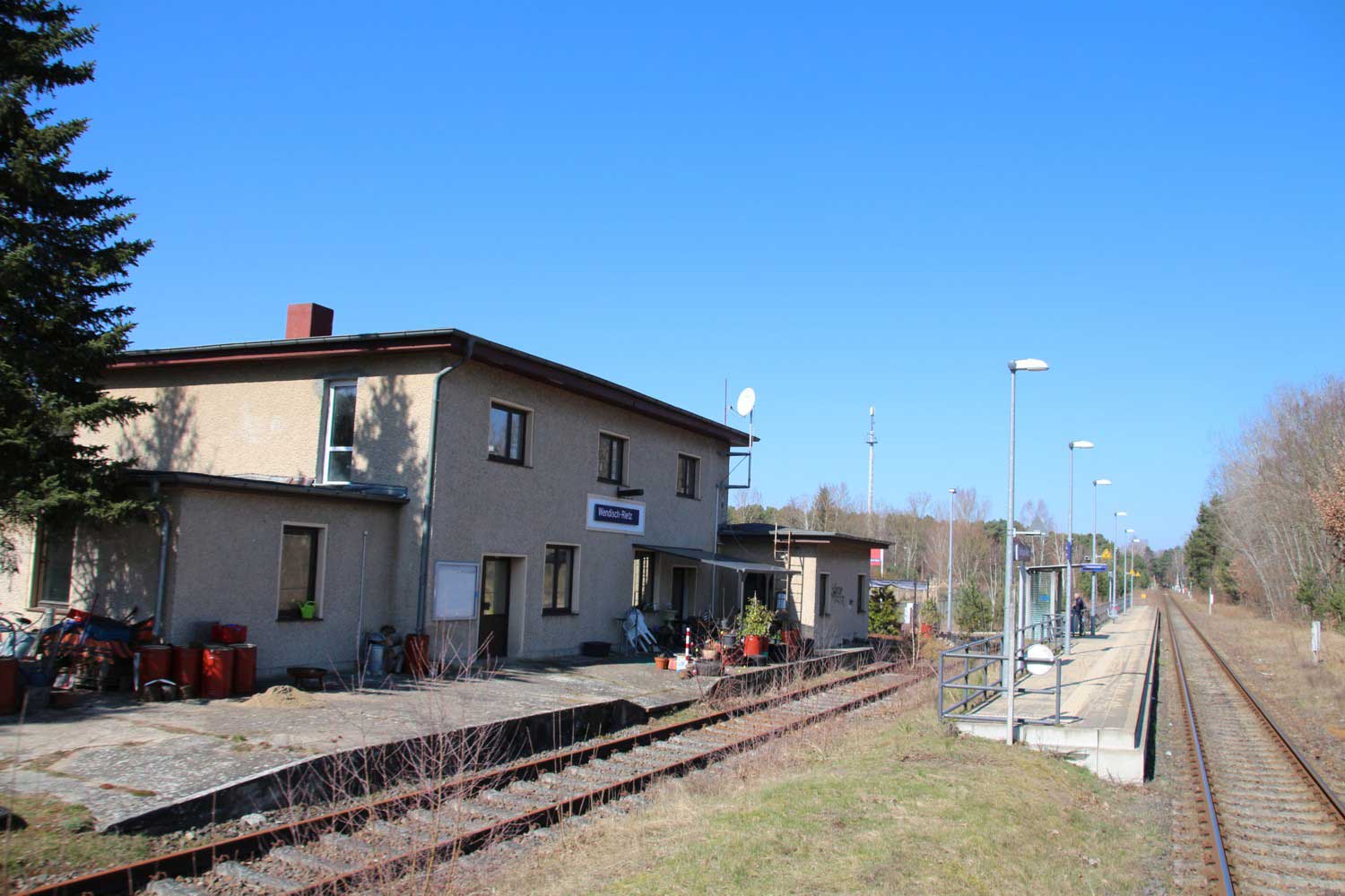Links am Gebäude km 129,3 der Strecke Großenhain Cottbuser Bf 0,0 - Senftenberg 45,29 - Cottbus 79,67 - Frankfurt (Oder) Pbf 152,85 (Personenzuggleise)/152,79 (Güterzuggleise)