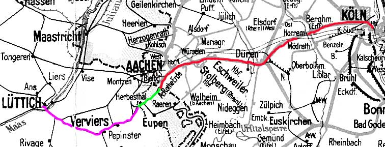 | km 0,0 der Strecke Aachen-Rothe Erde 0,0 - Walheim (b Aachen) 13,24 - Raeren 19,11 - Monschau 45,43 - Weywertz 66,50 - Born (Eifel) 82,89 - St. Vith 88,87 - Lommersweiler 95,06 - Lengeler 108,44 - Grenze Deutschland/Luxemburg 111,41 - [Troisvierges (Ulflingen)] (bis 1920 und 1940-1945) | ||