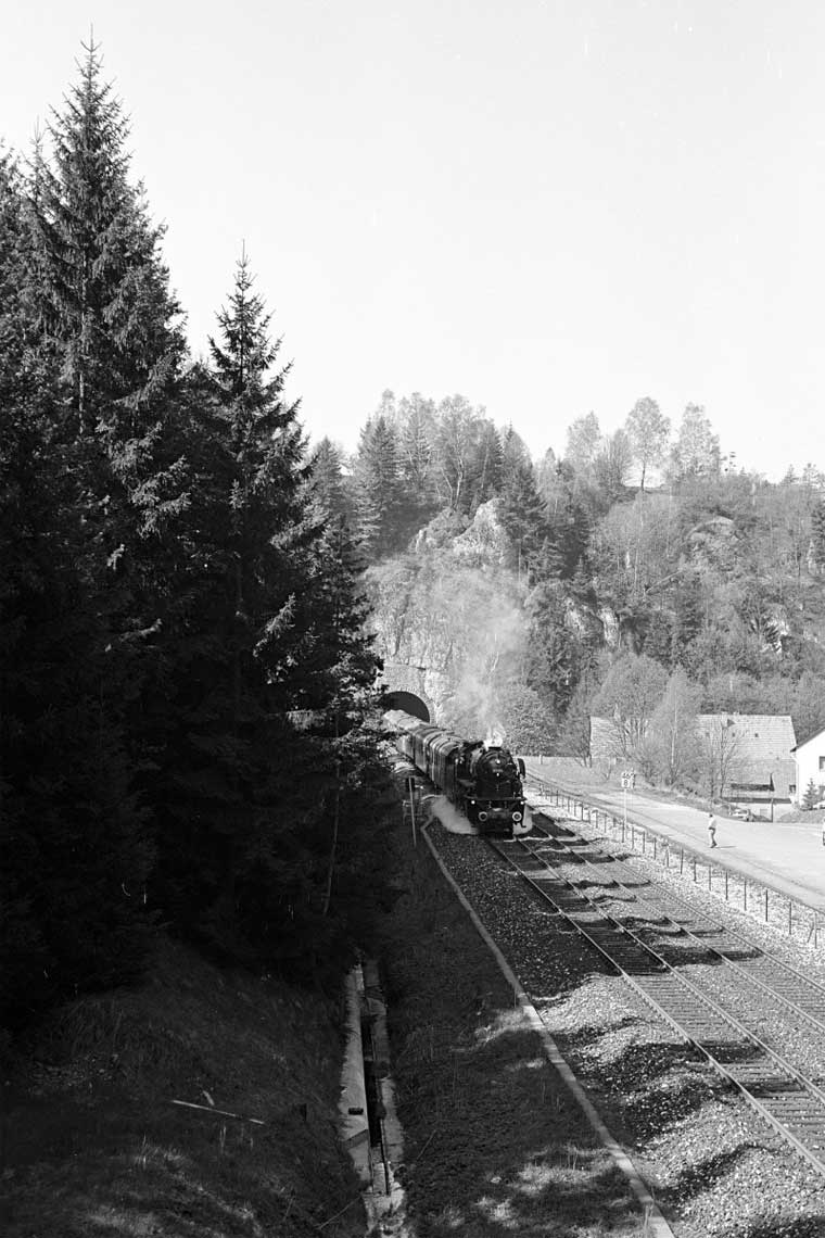 064 295 mit einer großen Rauchfahne bei der Ausfahrt Bf Kirchenlaibach mit km 93,5