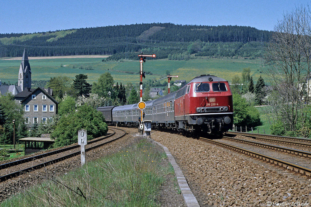 216 220 mit dem E 3893 (Hagen Hbf - Kassel Hbf) vor der Kulisse der Einfahrsignale von Nuttlar am 03.05.1990