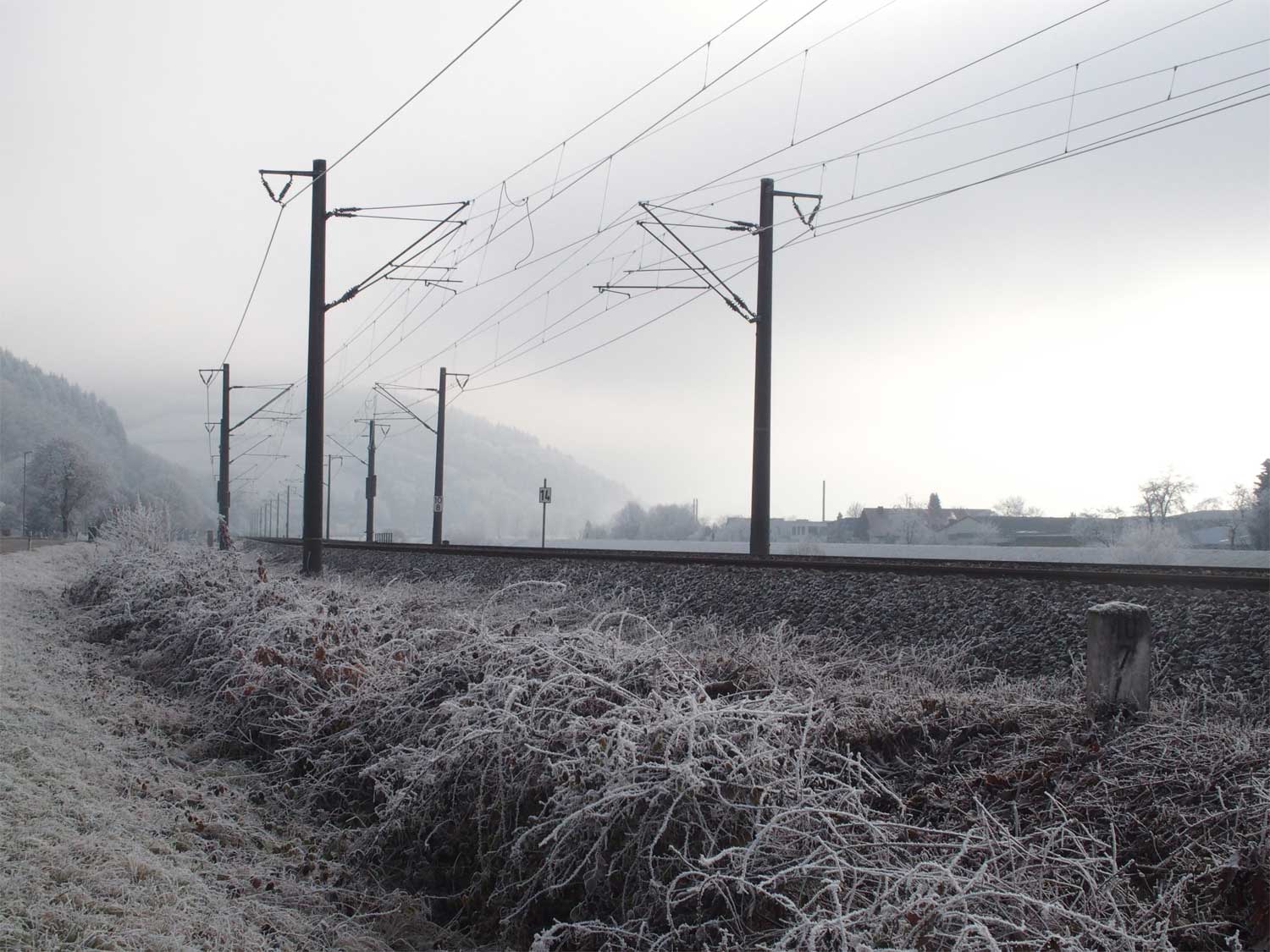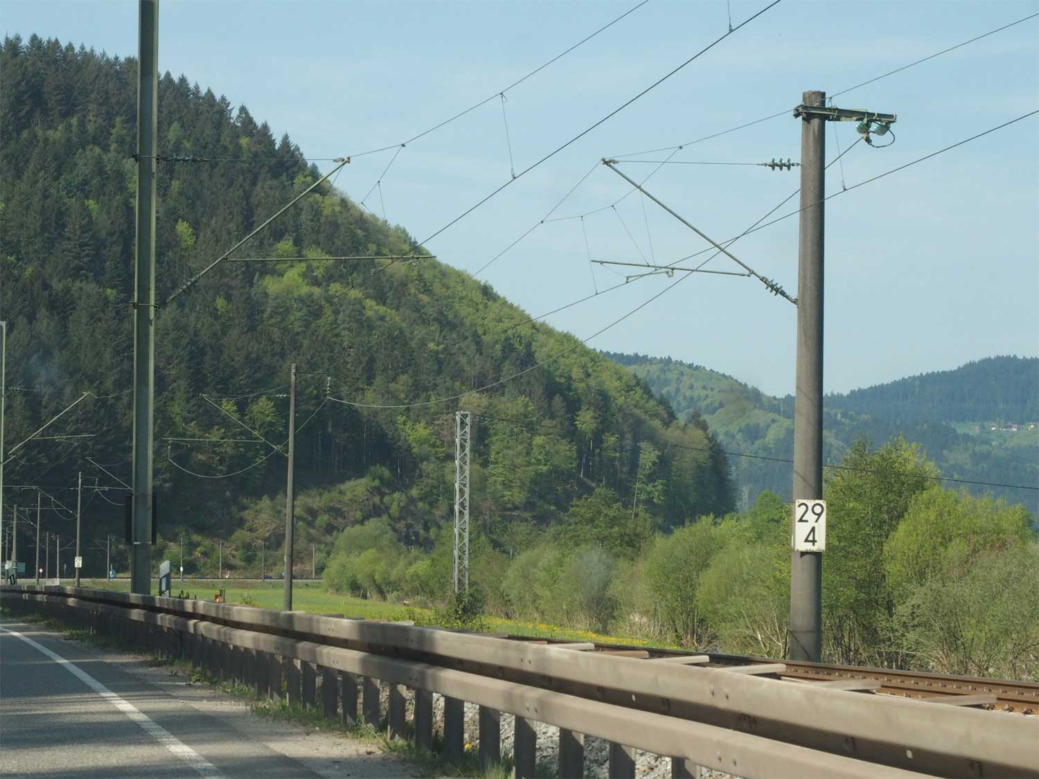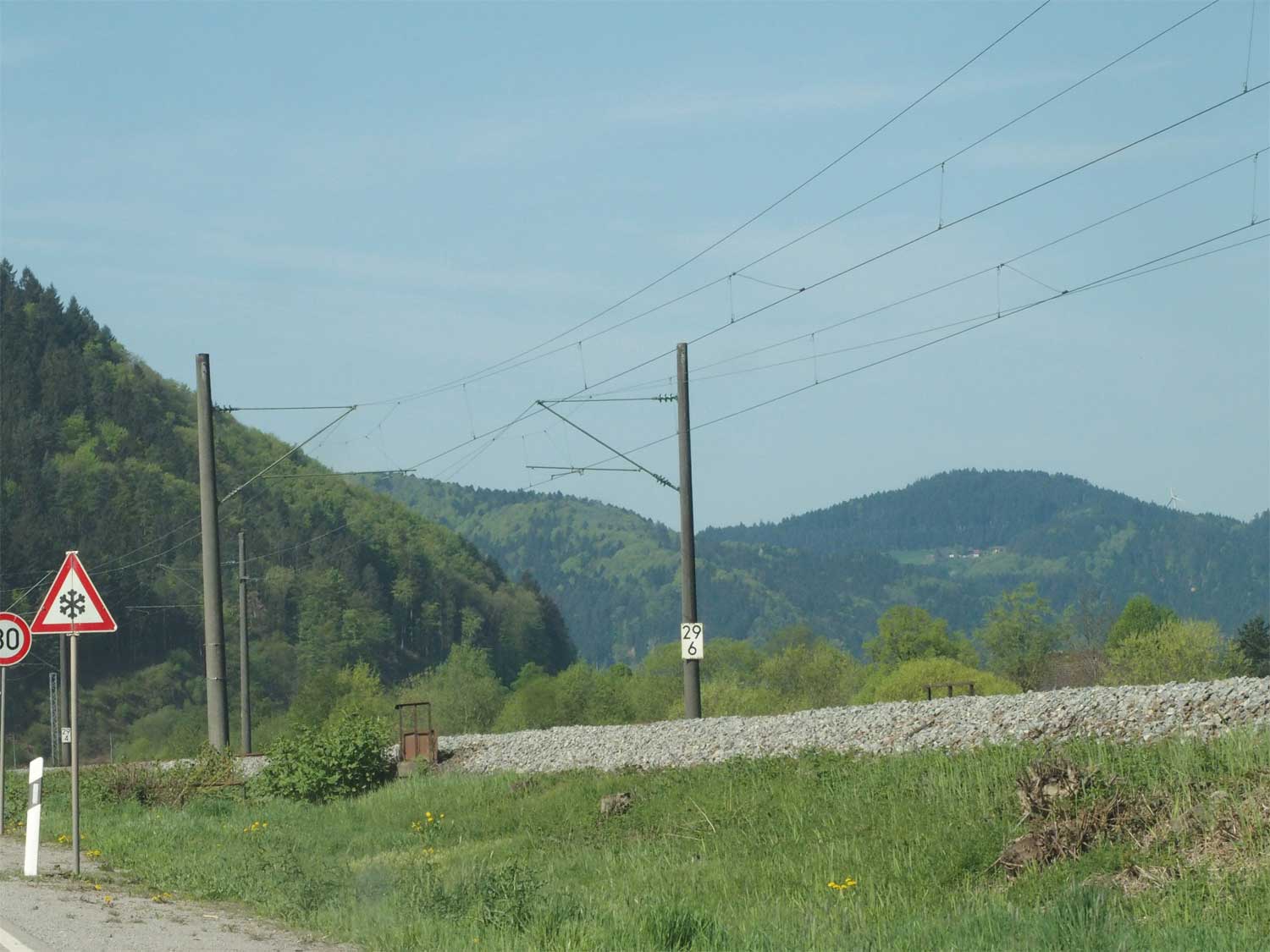 km 136,2 (Tafel) und km 136,3 (Stein, links) bei Engen - Blick Richtung Offenburg