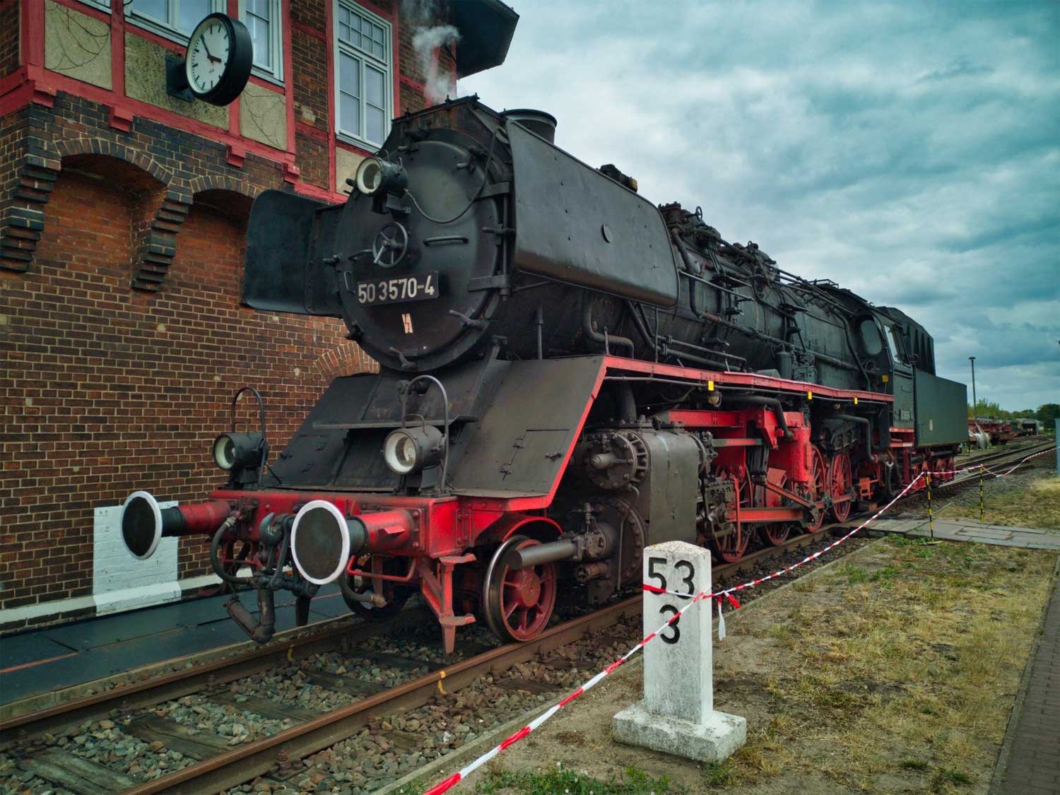 Neben der Lok befindet sich der Kilometerstein km 52,0 (?)