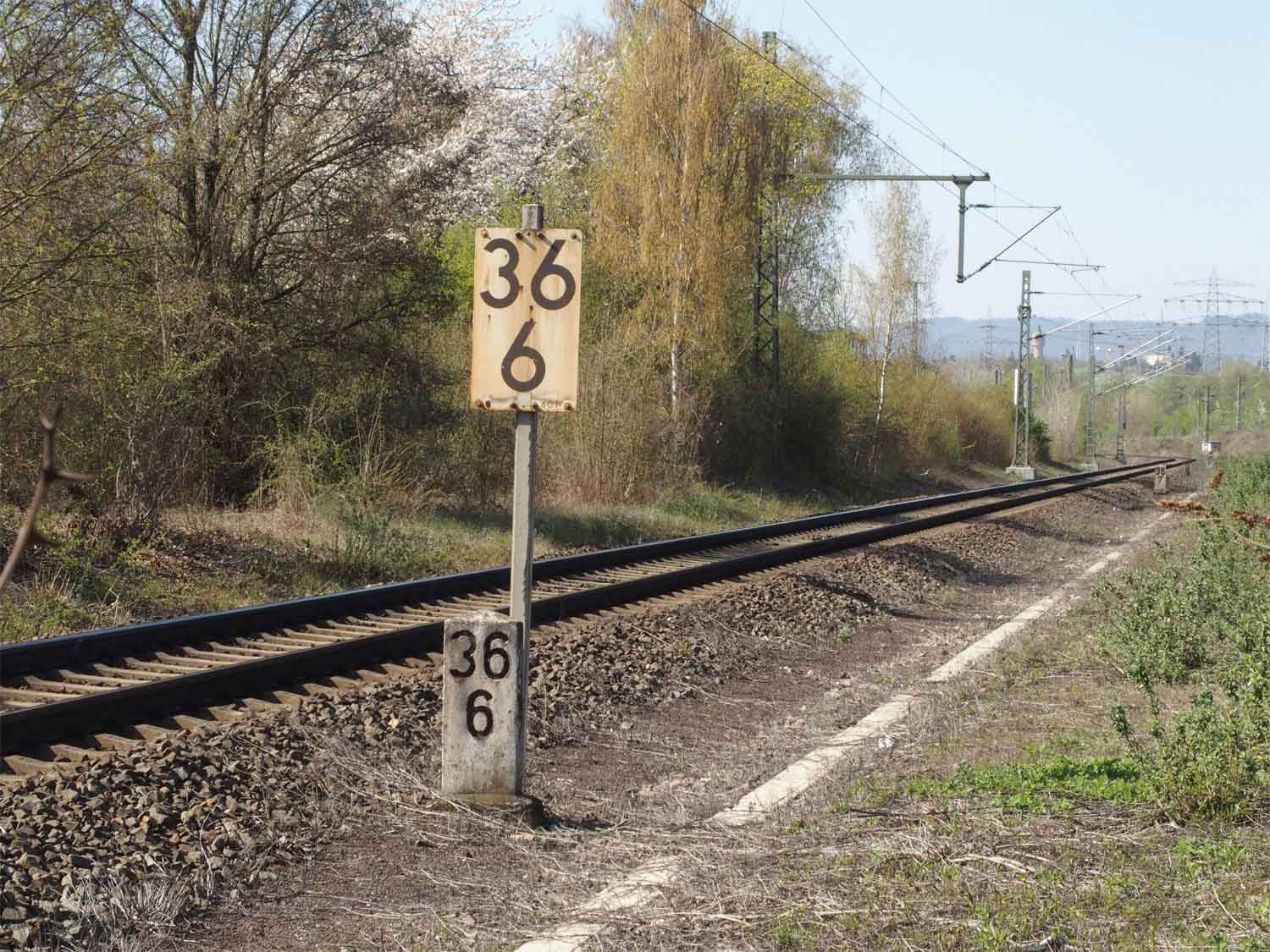 km 37,7 (Stein links, Gegenrichtungsgleis) und km 37,8 (Tafel und Stein, Richtungsgleis) zwischen Wiesbaden Ost und Wiesbaden-Biebrich - Blick Richtung Niederlahnstein