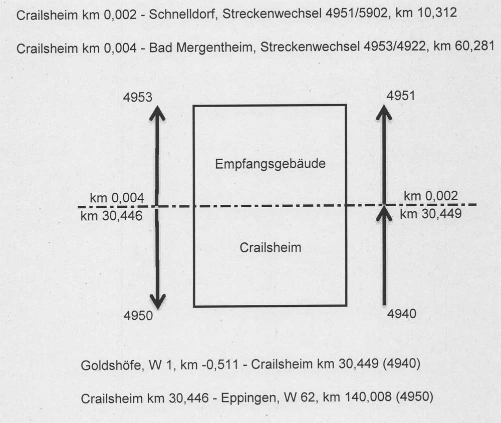 | Crailsheim | 0,00 | km 30,45 der Strecke Goldshöfe 0,0 - Crailsheim 30,45 - Schwäbisch Hall-Hessental 57,67 - Heilbronn Hbf 118,60 - Grenze BD Stuttgart/BD Karlsruhe km 140,412 [ = km 43,037 - Eppingen 40,76 - Grötzingen 0,0 (später auch Angabe Eppingen 142,69) (siehe auch Tabelle 3, Ziffer 4)] |