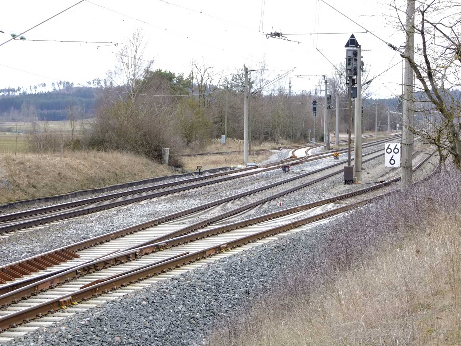 | km 0,0 der Strecke Nürnberg Hbf 0,0 - Schnabelwaid 74,96 - Marktredwitz 124,20 - Schirnding 138,30 - Grenze 140,584 - Eger 151,4 | ||