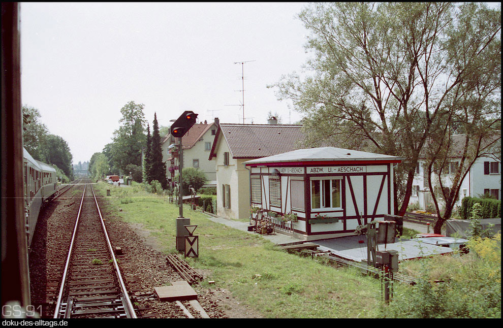 | Abzw Lindau-Aeschach | 0,0 | km 151,45 der Strecke Buchloe 0,0 - Biessenhofen 25,69 - Kempten (Allgäu) Hbf 62,46 - Fehllänge km 65,490 = km 67,000 - Immenstadt 84,49 - Lindau Hbf 152,94 |