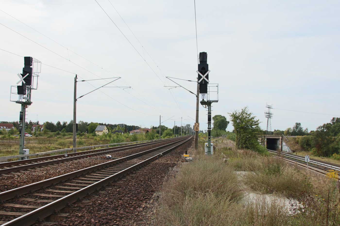 | km -1,82 der Verbindungsstrecke zur Nordbahn [Berlin Nordbahnhof (alt) 0,0 - Neustrelitz 98,53 - Neubrandenburg 133,73 - Stralsund 222,64 (kommend)/223,60 (gehend) - Saßnitz 272,72 - Saßnitz Hafen 274,46] | ||
