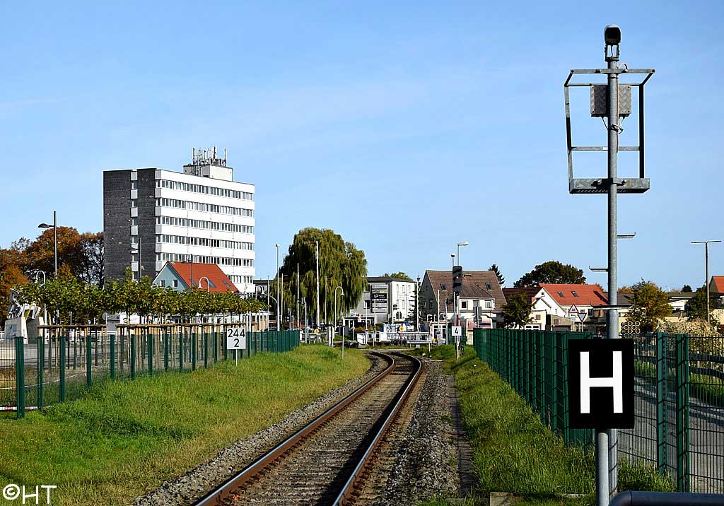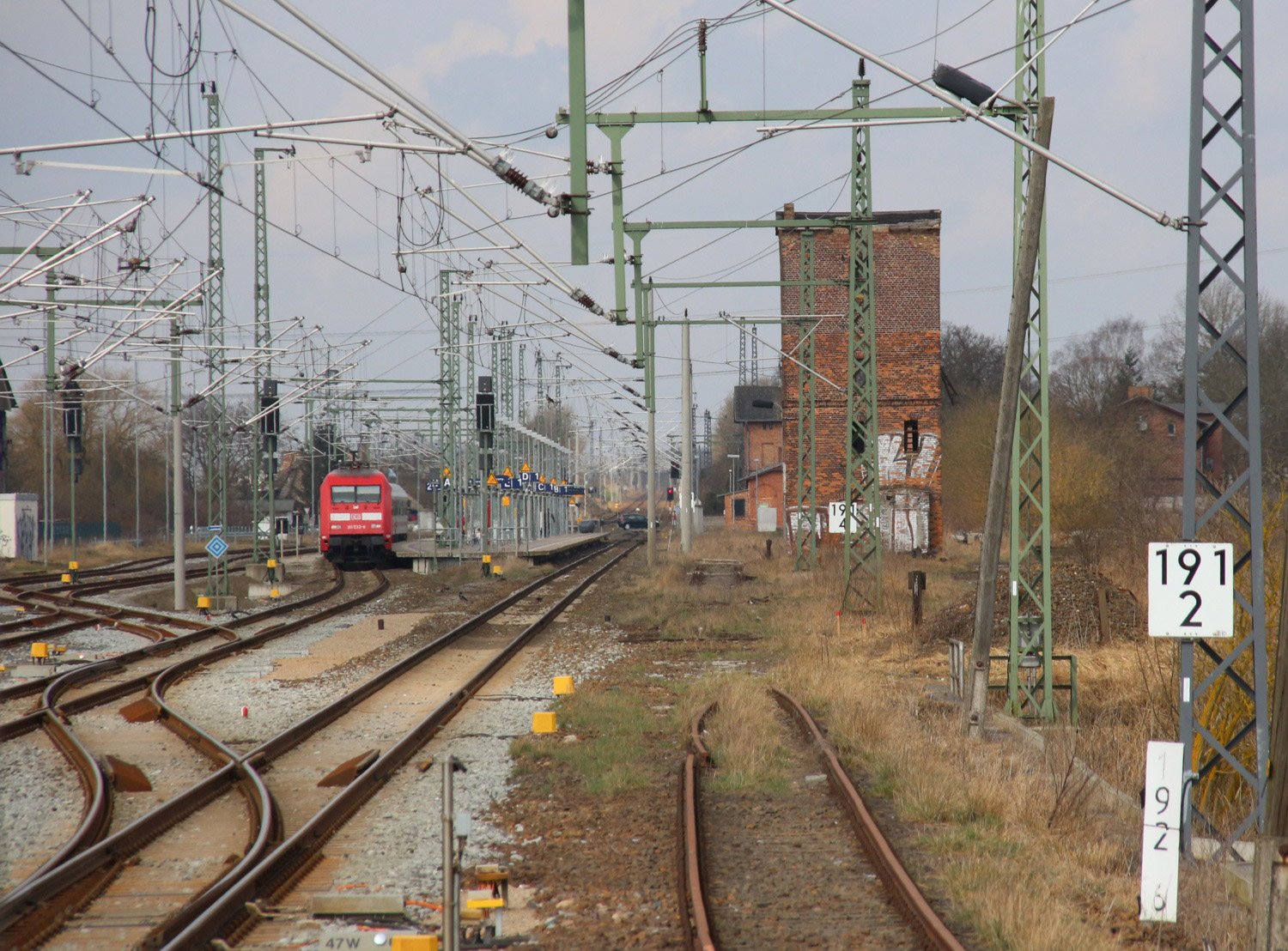 km 191,9 (genau: 191,894) ist Mitte Empfangsgebäude (E), rechts davon in Höhe Stellwerk B2 ist km 192,0 der Strecke nach Stralsund.