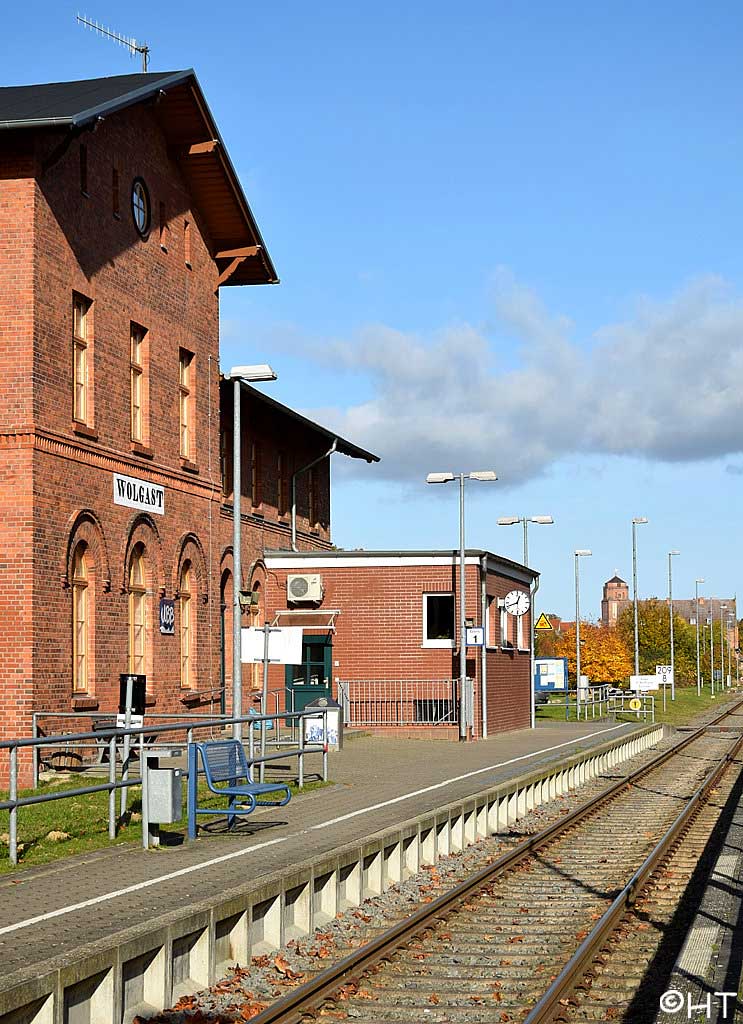 | Wolgast Hafen | 210,98 | km 48,75 der Strecke Greifswald 0,0 - Kemnitz 18,48 - Lubmin Dorf 29,9 - Cröslin 41,76 - Wolgast Kleinbf 49,4 (Kleinbahngesellschaft Greifswald-Wolgast) Spurweite 750 mm; zwischen Cröslin und Wolgast Kleinbf Dreischienengleis 1435 mm/750 mm |