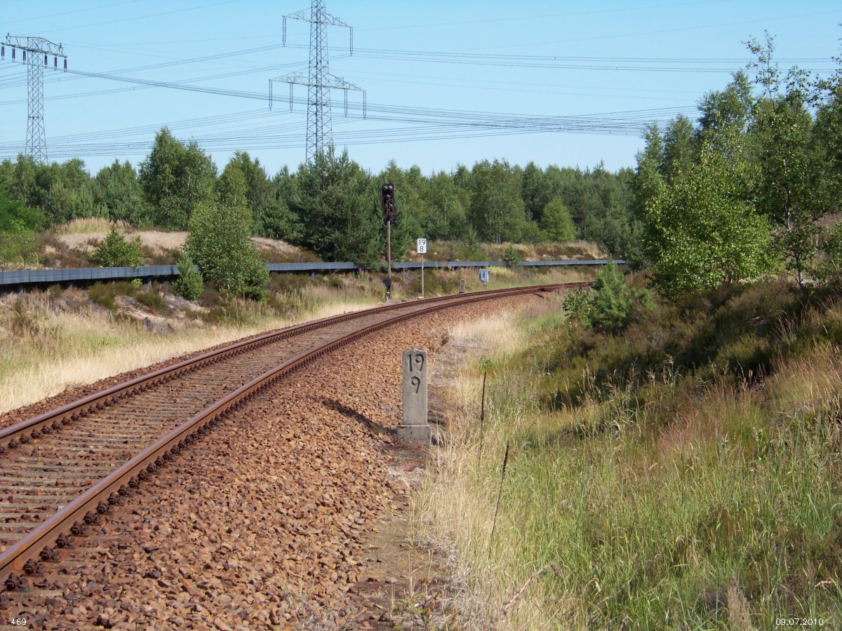 km 19,6 (Tafel) und km 19,7 (Stein) zwischen Abzw Graustein Süd und Graustein - Blick Richtung Abzw Spreewitz Süd - Knappenrode