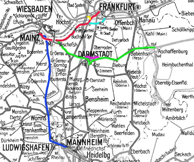 (Mainz Hbf - Mainz Süd) - Mainz-Bischofsheim - Abzw. Stockschneise - Darmstadt Hbf - Darmstadt-Kranichstein - Aschaffenburg (grün)