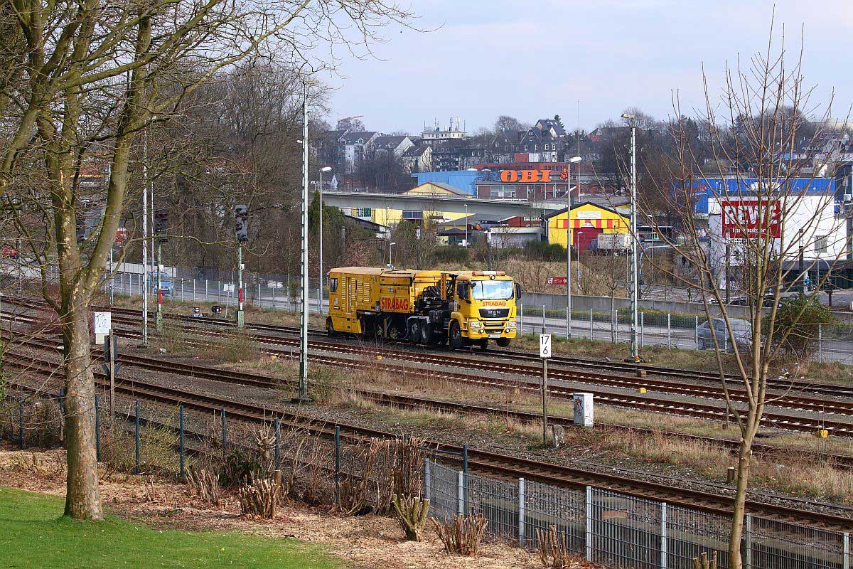 km 17,6 (Stein und Tafel) in Remscheid Hbf - Zweiwege-Schienenfräsmaschine SF02 W-FS Truck