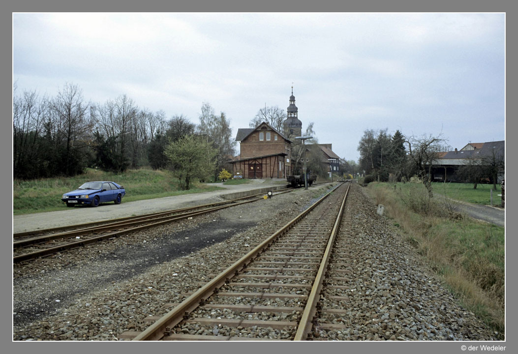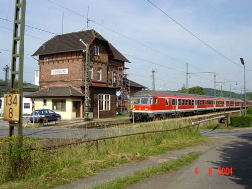 Bf Creidlitz Im Vordergrund die Strecke Eisenach - Lichtenfels Hinter dem Bahnhofsgebäude befindet sich die ehemalige Strecke nach Rossach (Foto: Dirk Ammon, August 2004) |