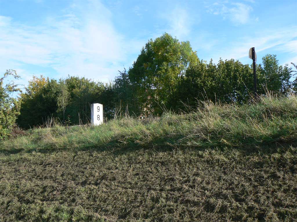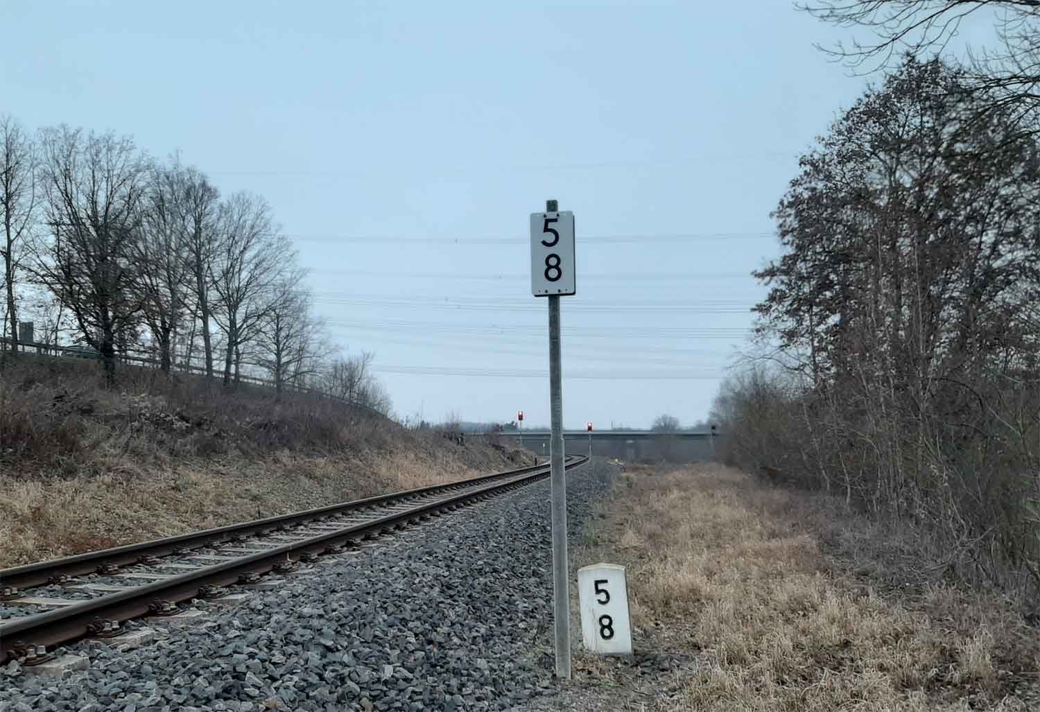 km 58,0 (Tafel) und km 58,1 (Stein) in Kürbitz - Blick Richtung Gera Süd