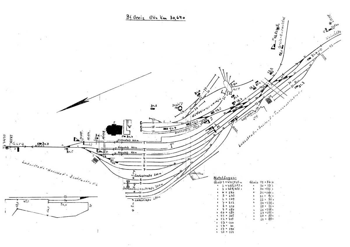| km 33,00 der Strecke Gößnitz -0,374 - Gera Hbf 34,68 (GGa) [nach 1945 verkürzt bis Gera Süd] bis 1968 | ||