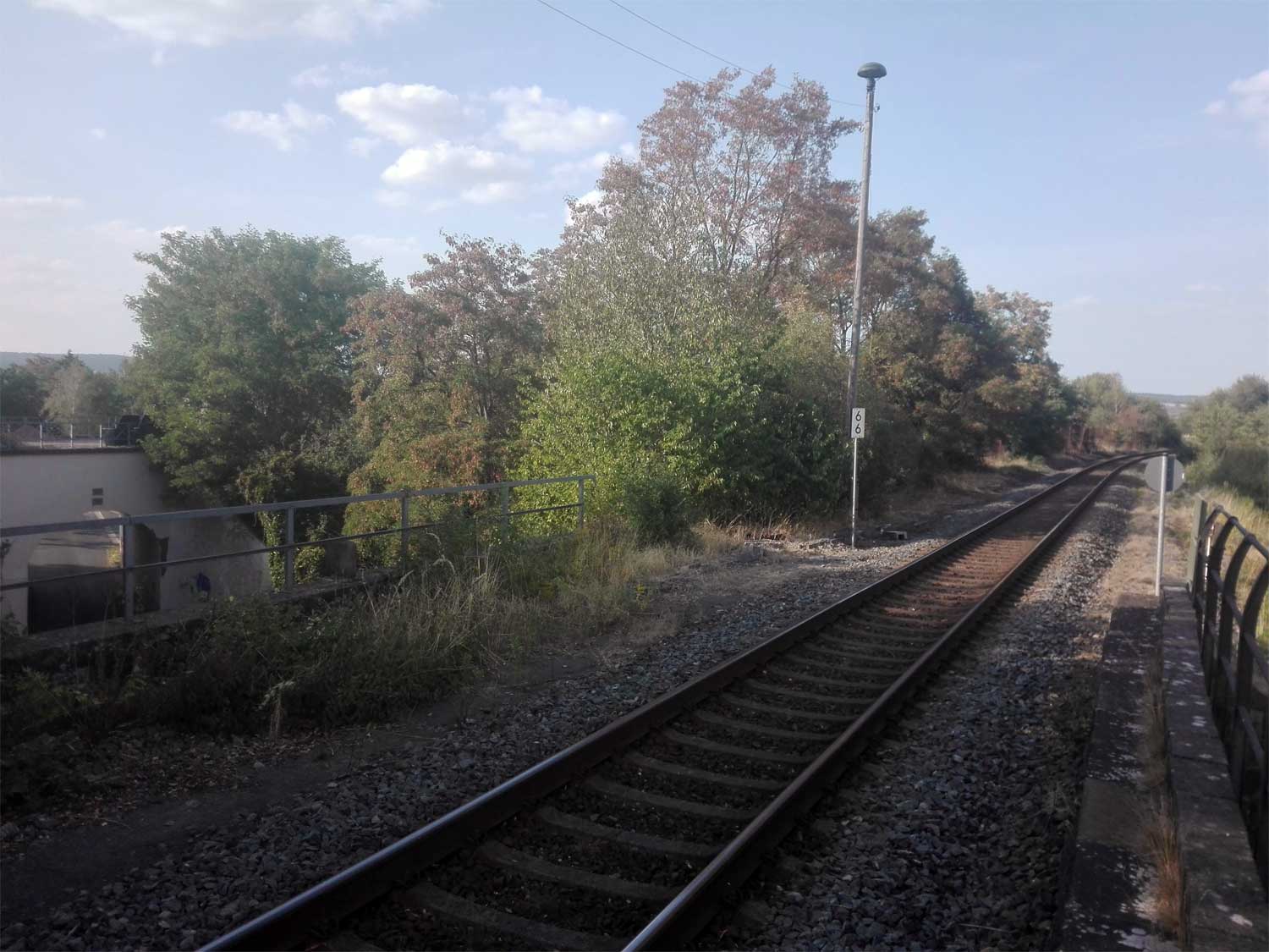 Der Weg ist das ehem. Gleis ins Ulstertal, links davon unter dem Busch das Gleis