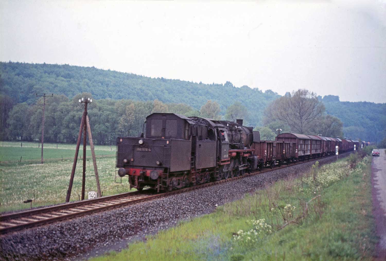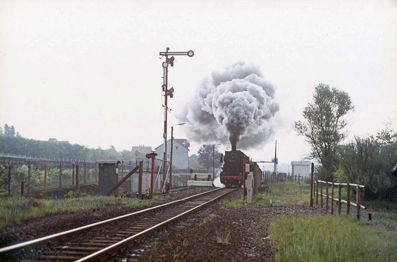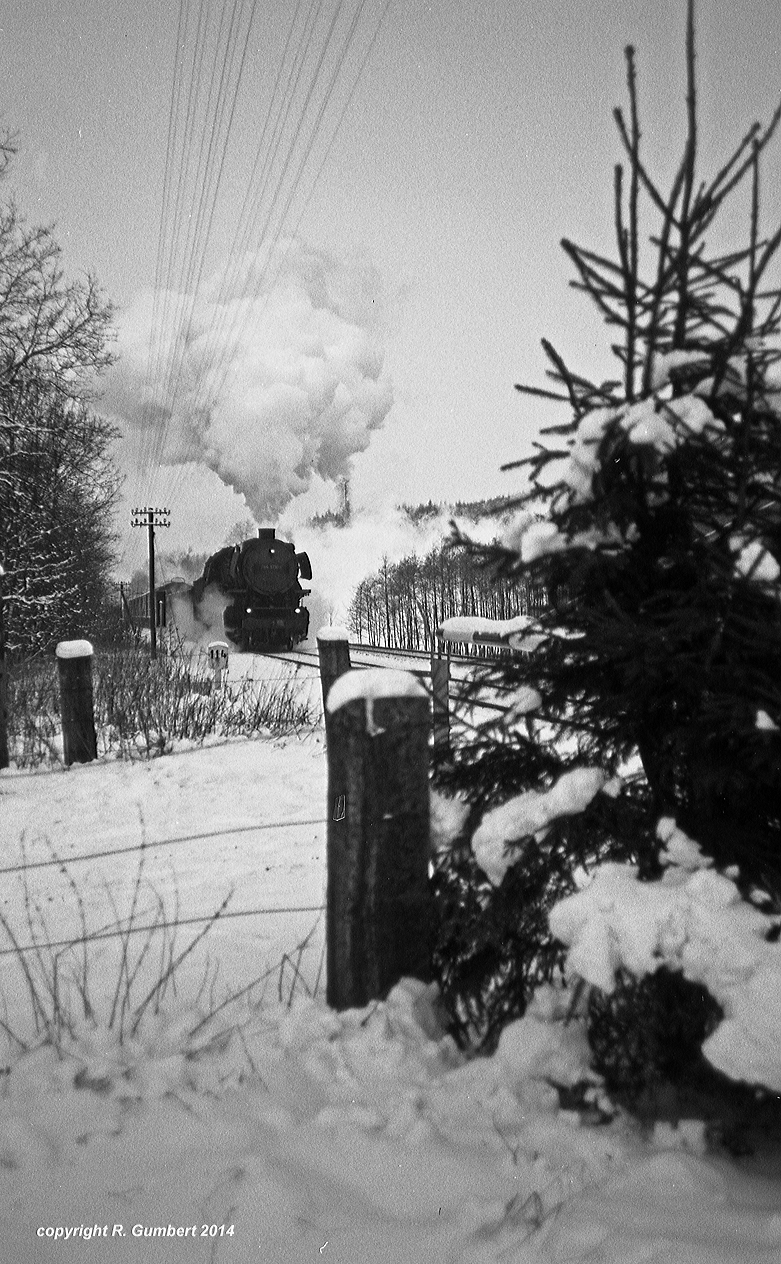 Nur ein kurzes Gastspiel gab die Baureihe 52 im Bw Nordhausen, weil nach der Abstellung der BR 44 nicht genügend Diesellok‘s zur Verfügung standen. Vorwiegend im Güterzugdienst, aber auch vor Personenzügen wurde sie eingesetzt. Im Juni 1983 ist 52 8179 bei Nordhausen Salza mit einem Pz nach Ellrich unterwegs. Am Regler stand Peter „Pollo“ Poloczek. Ihm sei dieses Foto gewidmet, viel zu früh musste er den Führerstand verlassen.