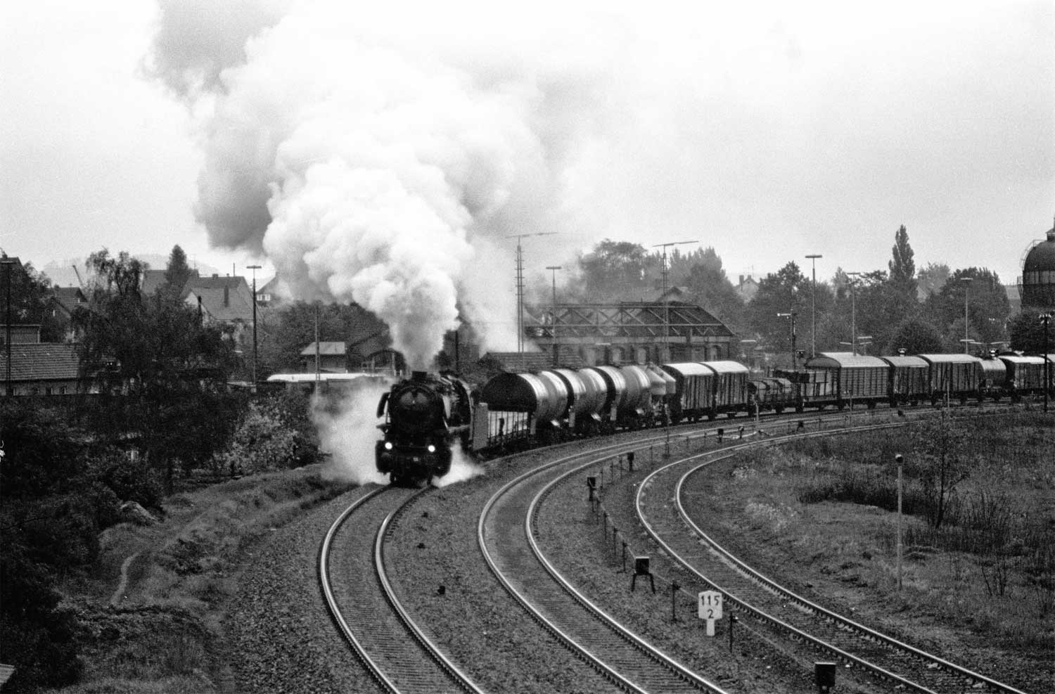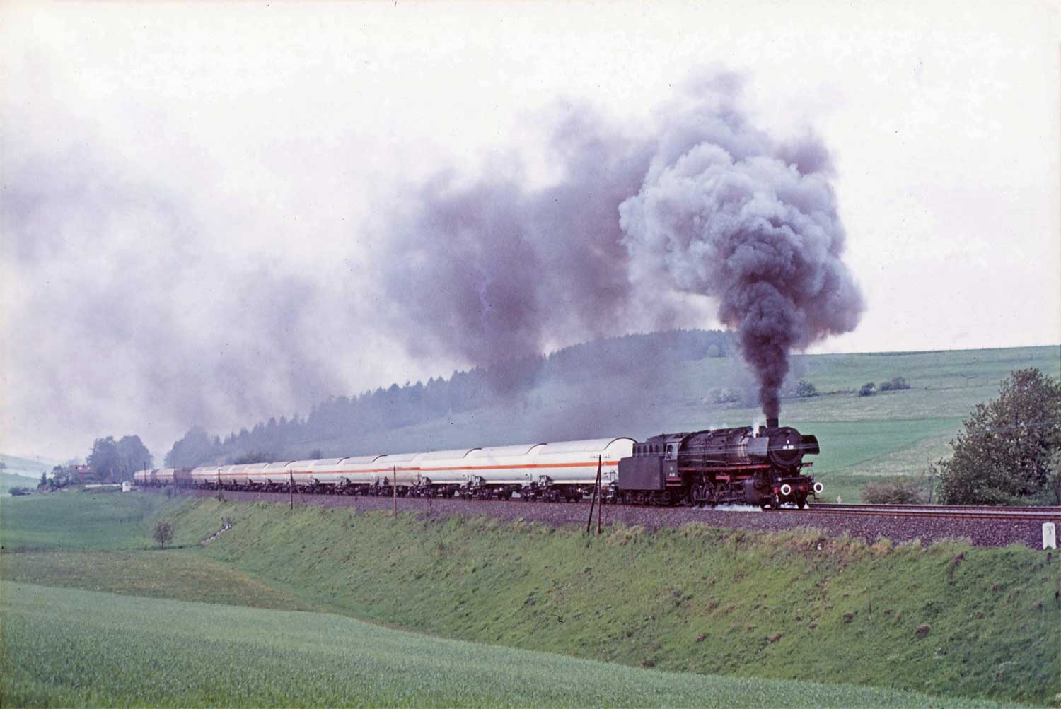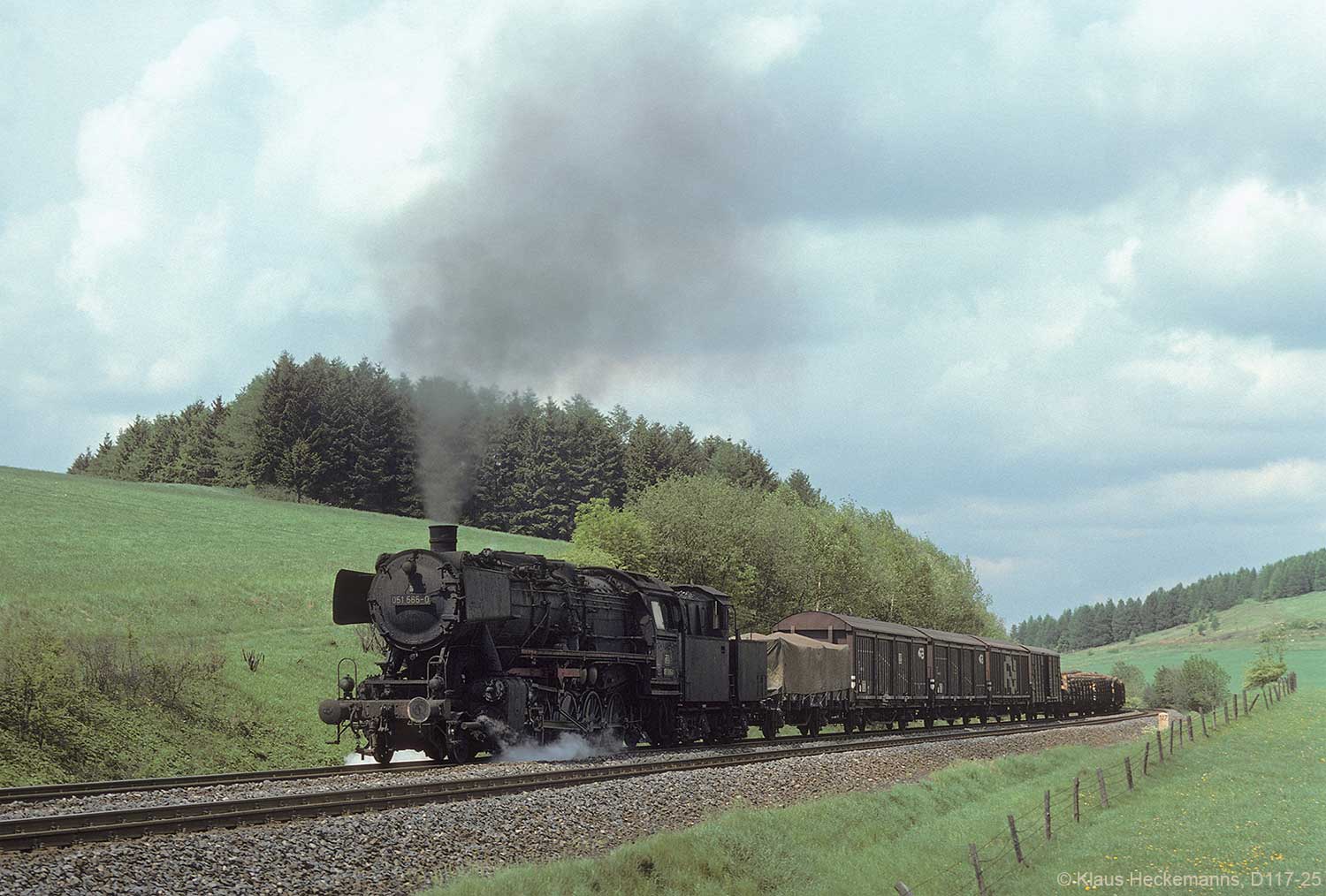 Nur ein kurzes Gastspiel gab die Baureihe 52 im Bw Nordhausen, weil nach der Abstellung der BR 44 nicht genügend Diesellok‘s zur Verfügung standen. Vorwiegend im Güterzugdienst, aber auch vor Personenzügen wurde sie eingesetzt. Im Juni 1983 ist 52 8179 bei Nordhausen Salza mit einem Pz nach Ellrich unterwegs. Am Regler stand Peter „Pollo“ Poloczek. Ihm sei dieses Foto gewidmet, viel zu früh musste er den Führerstand verlassen.