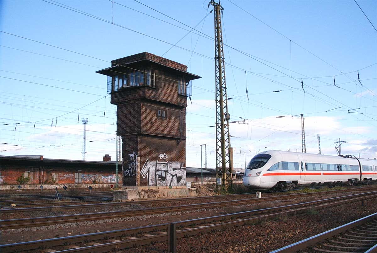 Blick von der Ringbahn auf das Stellwerk El (rechts) und den